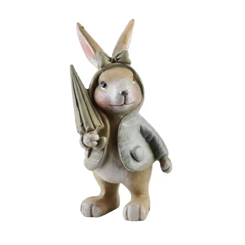 Urocza figurka zająca trzymającego parasolkę to wyjątkowa dekoracja, która wprowadza do wnętrza lekki i przyjazny klimat. Starannie wykonana z dbałością o detale, przyciąga wzrok i dodaje przestrzeni charakteru, łącząc zabawny motyw z eleganckim wykończeniem.